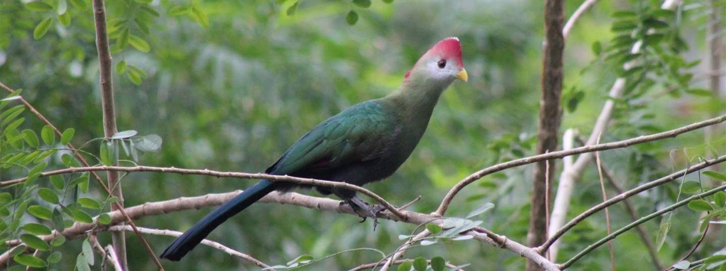 Turakos sind etwas scheu, aber wenn Sie sich etwas zurückhalten, haben Sie die Chance, hoch oben in der Blätterwelt von Rimbula Auge in Auge mit einem Turako zu stehen. In Rimbula leben drei verschiedene Arten: der violette Schildturako, der Rothaubenturako und der Weißwangenturako.